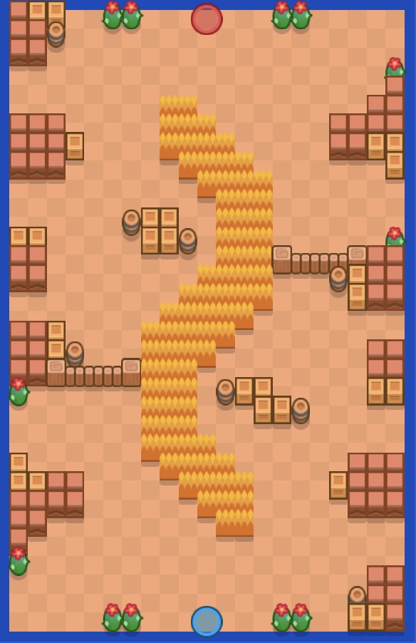 蛇が這うような形に草むらが広がっている。壁はあまり多くなく、やや開けたマップになっている。そのため、射程の長いキャラクターが有利になりやすい。しかし、草を利用しながらうまく近づくことができればアサシンキャラ等も候補に上がるだろう。