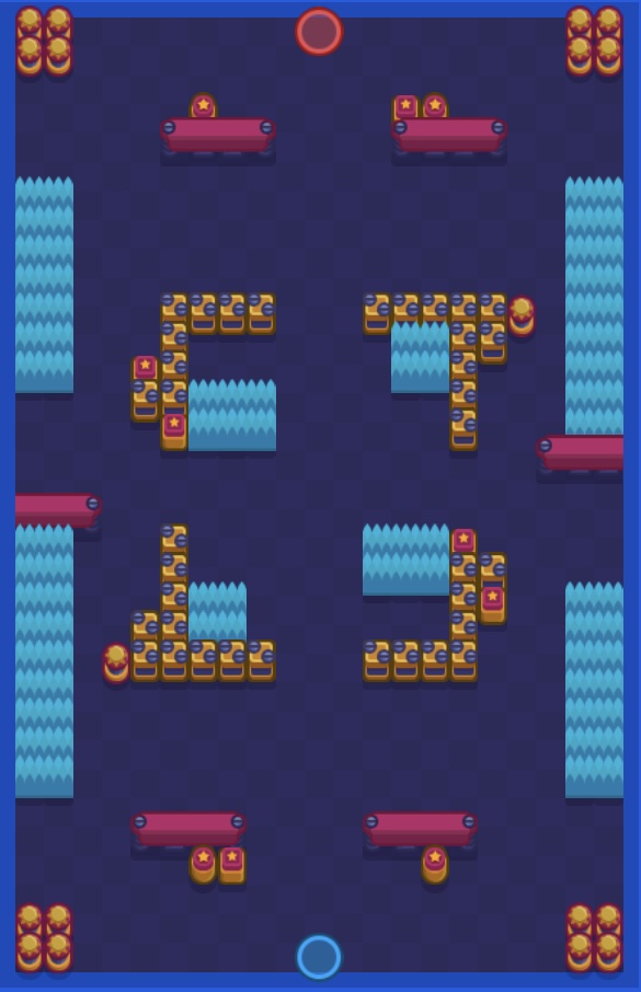 まず第一にマップが開けているため、長射程のキャラクターが挙げられる。特にスパイクは壁裏にも圧力をかけられるためオススメだ。また、真ん中の壁を利用して長期戦に持ち込むことも可能だ。盤面が小さくなってから、タラや、ダリルで一気に倒すのもいいだろう。また、手前の壁を壊して撃ち合いに持ち込むこともできる。こうした撃ち合いがしたい場合はブロックかコルトのガジェットを利用しよう。